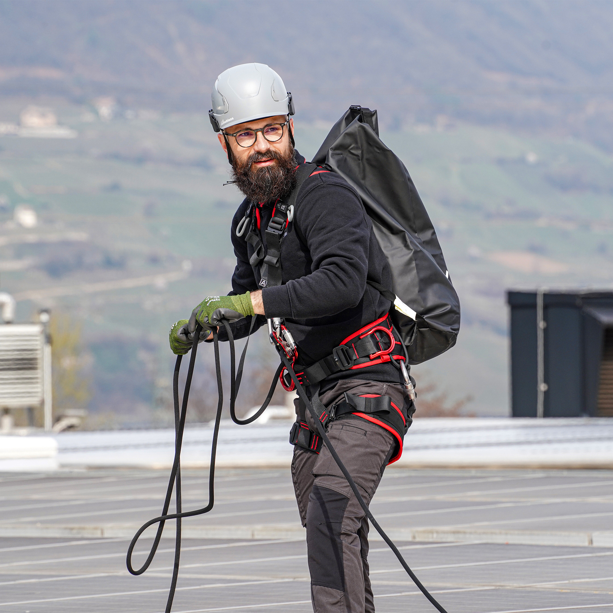 ROOF PRO — это профессиональный страховочный комплект для кровельных работ, включающий в себя комплектную страховочную привязь SPARTA для защиты от падения и позиционирования, 15-метровую полустатическую веревку ROPE1 с самоблокирующимся карабином и съемное направляемое страховочное устройство BACK.