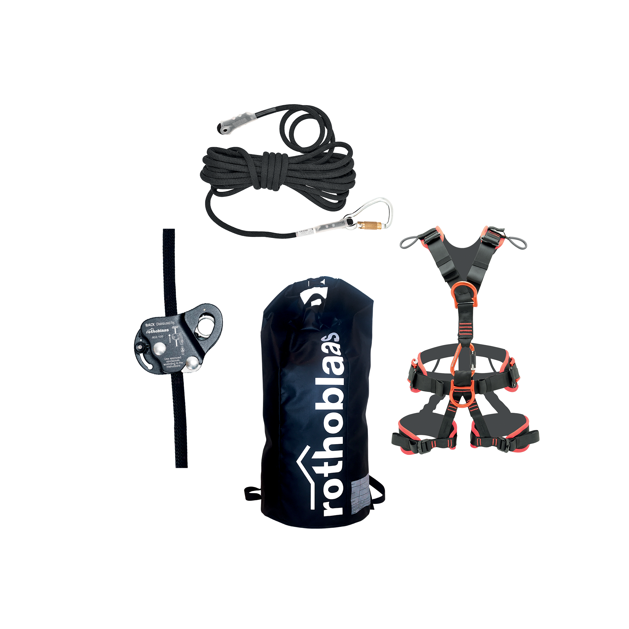 ROOF PRO — это профессиональный страховочный комплект для кровельных работ, включающий в себя комплектную страховочную привязь SPARTA для защиты от падения и позиционирования, 15-метровую полустатическую веревку ROPE1 с самоблокирующимся карабином и съемное направляемое страховочное устройство BACK.